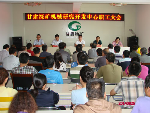 2014年8月26日,甘肃探矿机械研究开发中心召开全体职工大会,党委书记孟永鹏传达了省地矿局局长苟少峰在上半年地勘经济形势分析会上的讲话和在学习省委十二届八次全委(扩大)会议精神大会上的讲话,主任曾永刚通报了探矿机械研发中心生产经营管理情况。