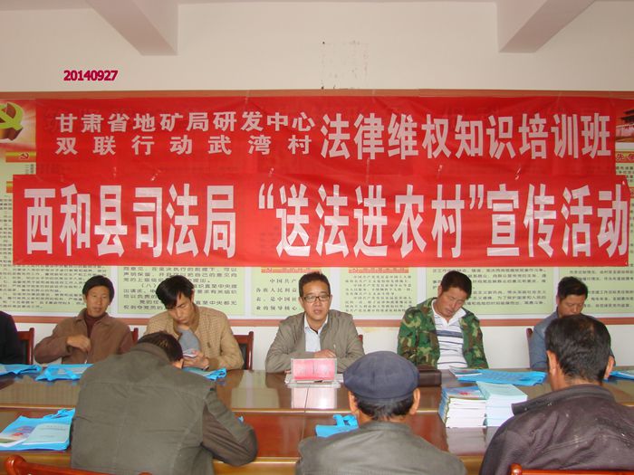 甘肃探矿机械研发中心按照省地矿局联村联户为民富民协调推进领导小组的要求,在西和县苏合乡党委、政府和武湾村委会协调配合下,解民忧帮民富,扎实推进双联工作。2014年9月26日,探矿机械研发中心主任曾永刚、党委书记孟永鹏、工会副主席何汝强一行来到西和县苏合乡武湾村,走访和慰问了部分困难村民,为他们送去了节日的祝福和组织的关怀。9月27日,联合西和县司法局法律援助中心和林业局举办了两期培训班,并邀请法律援助中心主任颉卫东和林业局高级工程师刘永平为武湾村村民讲解了法律维权和核桃种植等知识。