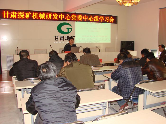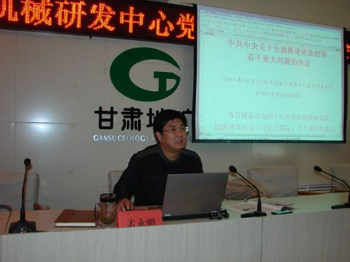 2014年12月18日,探矿机械研发中心召开党委中心组学习会,党委书记孟永鹏主持学习了《中共中央关于全面推进依法治国若干重大问题的决定》,集体观看了由中央纪委宣传部与中央电视台联合制作的电视专题片《作风建设永远在路上》之《承诺与期盼》、《正风肃纪》。 党委书记孟永鹏强调,党员干部做为服务于职工的带头人,一定要善于学习,开阔眼界,提升修养,从自身做起,强化学法、知法、懂法、守法的理念,学会用法律武器维护合法利益;要明确自已的责任,勇于担当,用规章制度来约束自身行为;要完善单位的制度、规章,依规治厂,依纪管厂,更好地为单位服务。