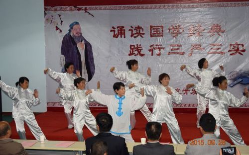 在退休职工刚柔相济、动静结合的太极拳表演中,诵读活动拉开了序幕。八十岁高龄的宋允茂老人深情吟诵《临江仙·滚滚长江东逝水》,把大家带回到历史的长河中。在阵阵悠扬的古琴声中,来自生产车间、机关科室的在职职工押着千古经典的韵脚,踏着婉约激昂的节拍,诵读了底蕴深厚的国学经典《论语》、《孟子》、《诗经》、《孝经》、《道德经》、《大学》等,吟唱了古典宋词《一剪梅·红藕香残玉簟秋》、《满江红·怒发冲冠》、《水调歌头·明月几时有》。在诵读饱含豪情壮志的《沁园春·长沙》《沁园春·雪》、《中华颂》后,一首现代爱国诗歌《我的祖国》把诵读活动推向了高潮。